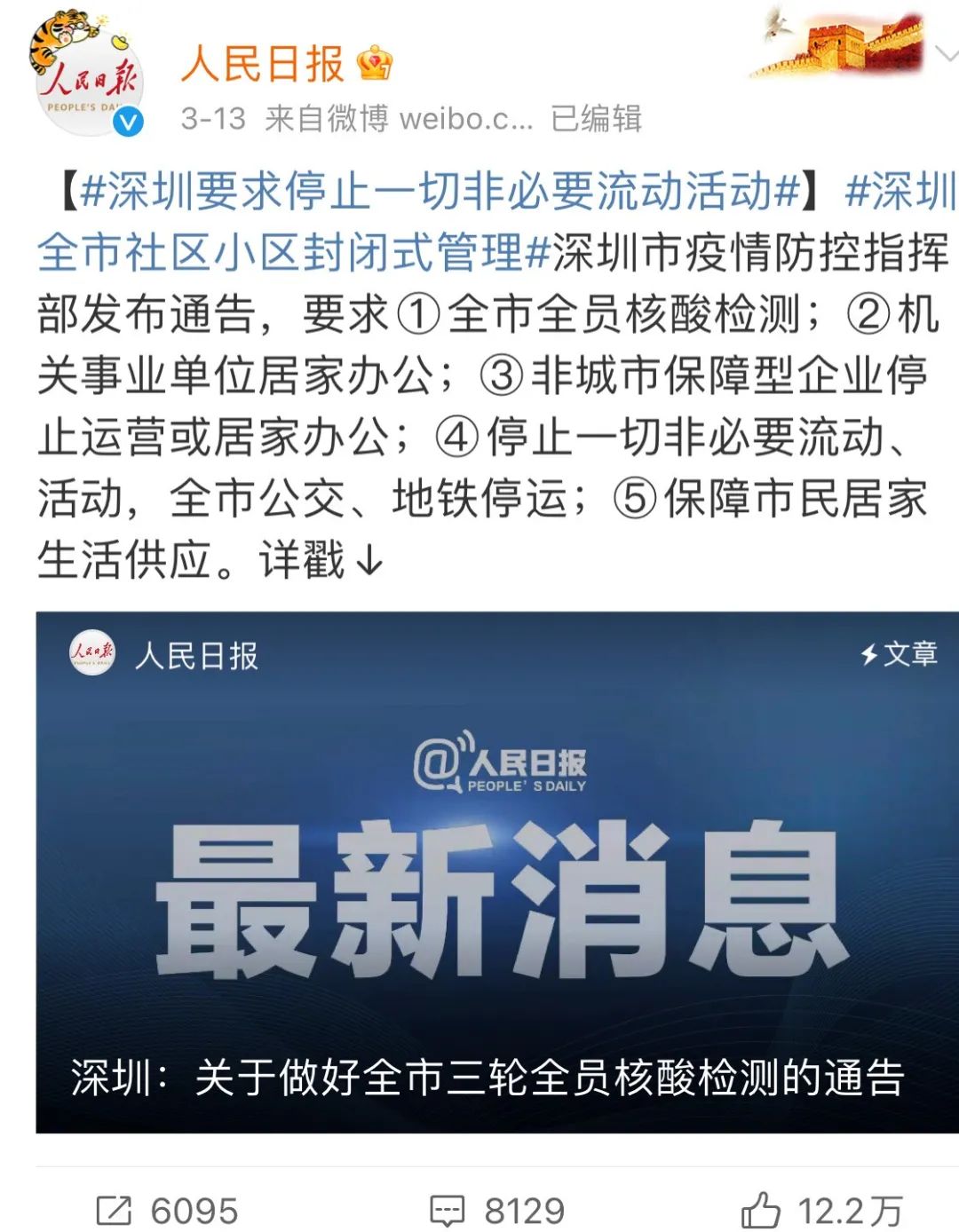 此外,非城市保障型企业停止运营或居家办公;除保障城市运行及供港物资货运的交通外,深圳全市公交、地铁停运;全市社区小区、城中村、产业园区实行封闭式管理;全市人员非必要不离深,确有特殊需要,一律凭24小时核酸阴性证明离深。