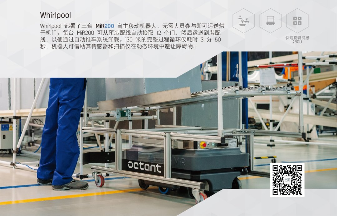 Whirlpool 部署了三台 MiR200 自主移动机器人,无需人员参与即可运送烘干机门。每台 MiR200 可从预装配线自动拾取 12 个门,然后运送到装配线,以便通过自动推车系统卸载。130 米的完整过程循环仅耗时 3 分 50秒,机器人可借助其传感器和扫描仪在动态环境中避让障碍物。