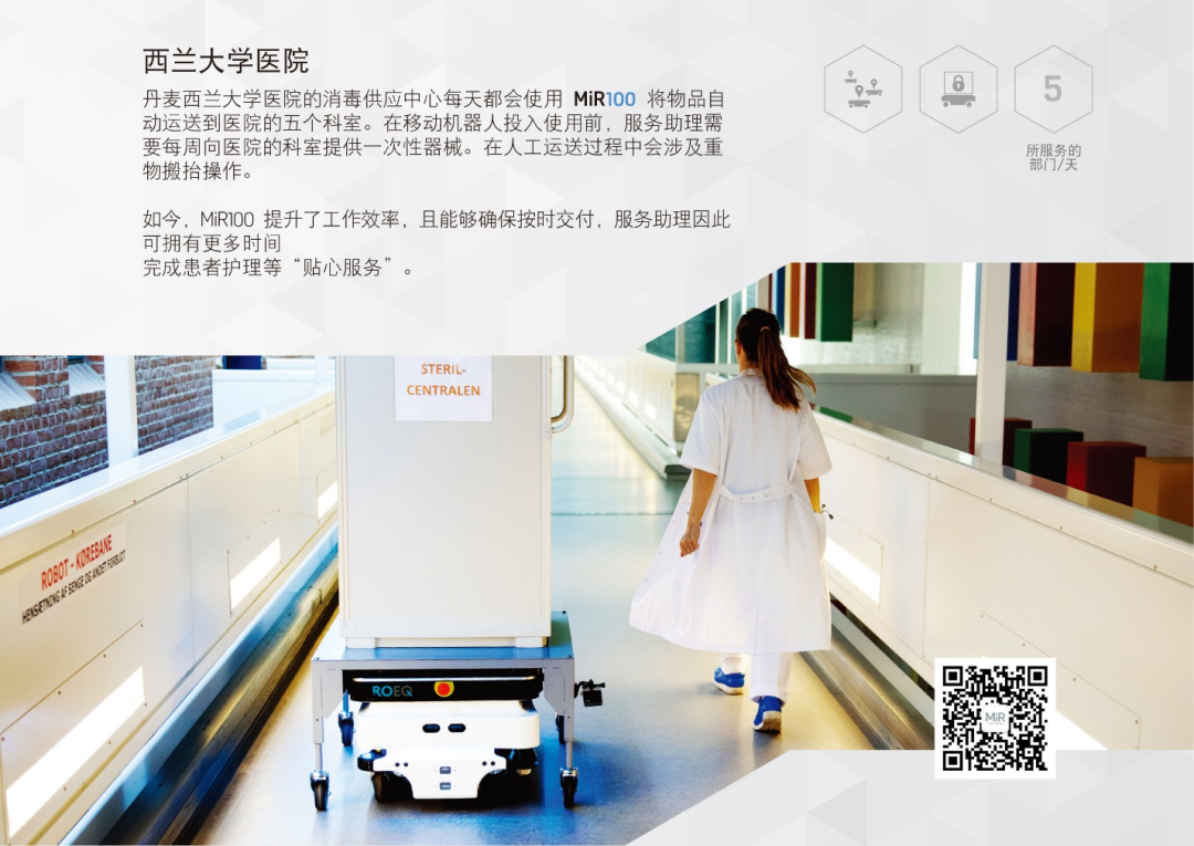 丹麦西兰大学医院的消毒供应中心每天都会使用 MiR100 将物品自动运送到医院的五个科室。在移动机器人投入使用前,服务助理需要每周向医院的科室提供一次性器械。在人工运送过程中会涉及重物搬抬操作。
