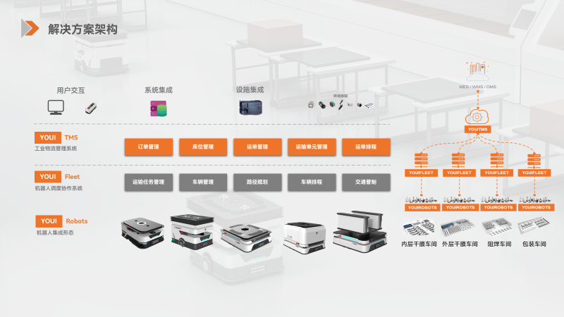 在移动机器人基础上,优艾智合智慧物流管理系统YOUI TMS与企业MES、WMS等信息化系统对接,100%追踪回溯每一件物料信息,完成物料从备料仓到产线再到成品仓的完整闭环,在提质增效的基础上帮助企业实行柔性生产与数字化管理。