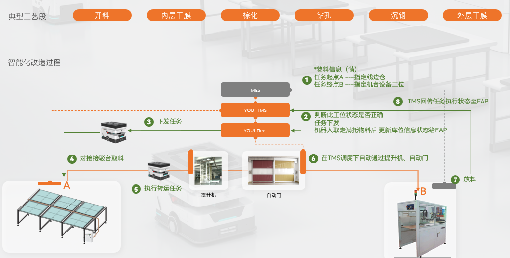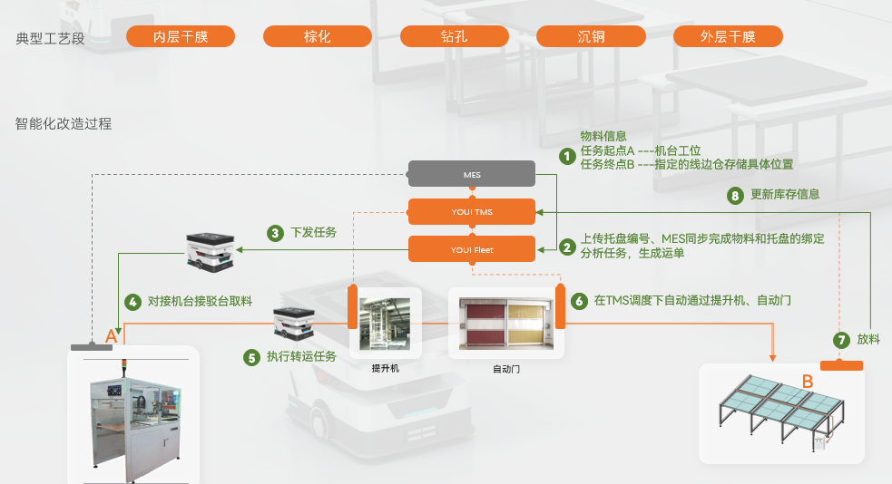 针对该PCB软硬结合板制造工厂,优艾智合引入84台移动机器人及YOUI TMS智慧物流管控系统,实现全场物质流与数据流的打通。