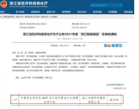 近日,浙江省经济和信息化厅官网公布2021年度“浙江制造精品”名单,华睿科技自主研发的“华睿复合导引的AGV多车协同算法与大场景应用平台”成功入选。