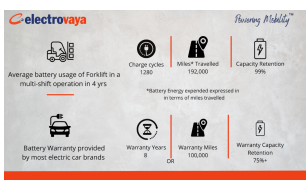 Electrovaya 的数据研究专家 Niloofar Zarifi 博士说:“我们观察到,经过四年多班次运营后,容量衰减可以忽略不计。”他使用公司专有的 Evision 软件研究电池性能。对于我们在 24/7 配送中心运行的电动叉车电池,每天的耗电量在 0.8 到 1.5 个充电周期之间。使用 35 kWh 电池运行的典型叉车在每个充电周期提供的功率大约相当于在典型的电动汽车(使用 40KWh 电池)上行驶 150 英里。考虑到平均每天一个充电周期和一年 320 个工作日,这相当于每年行驶 48,000 英里。在四年内,这相当于驾驶 192,000 英里(或 1,280 个充电周期)而电池几乎没有退化,预计电池容量达到 100 万英里。”