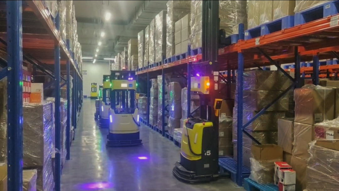 多型号叉取型AMR同一巷道调度,一层库位优先使用地牛AMR搬运,高层库位调度堆垛型叉车搬运,用户综合成本低;
