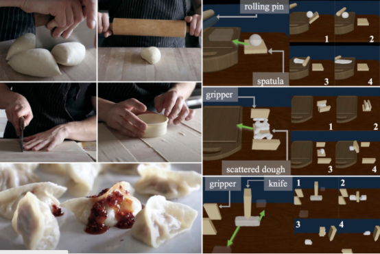 对于机器人来说,处理像面团这样的可变形物体是很棘手的,因为面团的形状可以以多种方式改变,这很难用方程式来表示。此外,从面团中创造一个新的形状需要多个步骤和使用不同的工具。对于一个机器人来说,学习一个具有长序列步骤的操作任务是特别困难的--那里有许多可能的选择--因为学习往往是通过试验和错误进行的。