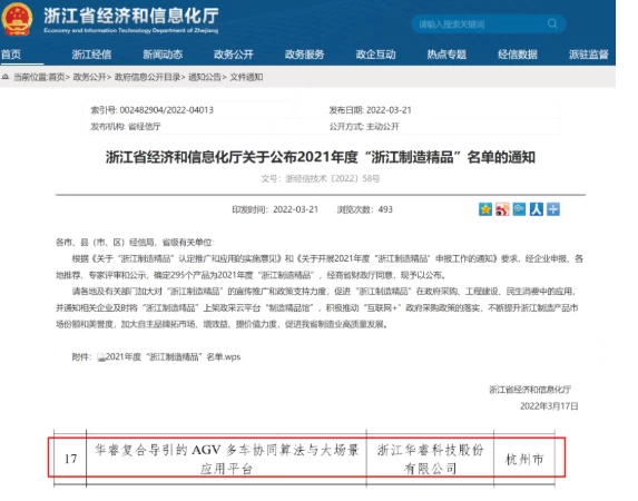 6、浙江省经济和信息化厅官网公布2021年度“浙江制造精品”名单,华睿科技自主研发的“华睿复合导引的AGV多车协同算法与大场景应用平台”成功入选。
