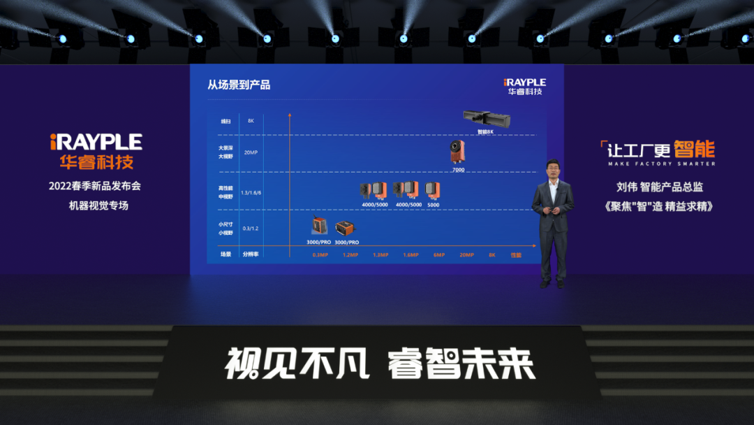华睿科技智能相机产品总监刘伟在本次发布会上以“聚焦‘智’造 精益求精”为主题的新品。他表述:“为了更好的满足智能制造和信息追溯的快速发展,服务于精益智造和精准识别”,本次隆重推出智能读码器、智能相机 、3D相机三大类新产品。智能读码器系列,围绕算法、光学、变焦三方面推新迭代,不断提高读码准确性和速度;提供丰富的光学配件以及一键配件等功能,让操作部署更简单。本次共发布3000/3000PRO/4000/5000/7000/智能线扫系列,分辨率从30万到2000万。3000系列读码器结构紧凑,可满足狭小空间安装;4000系列是一款全新产品,很好地兼顾了高度集成、性能强大和方便易用的特点;5000系列具有60fps高采集帧率,20毫秒级低耗时,可支持3m/s 读码;7000系列本次带来了2000万全局曝光,做到超大分辨率和超大视野的同时还可以支持更高运动速度,可保障高节拍和高效率,微妙级的补光时间,减少光污染;8K智能线扫,超高分辨率,光源镜头一体化集成设计。可广泛应用于3C、锂电、光伏、物流、PCB、汽车、半导体、食品饮料等行业。