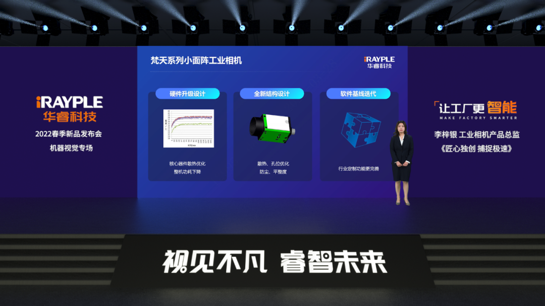 华睿科技工业相机产品总监李梓银在本次发布会上带来了“匠心独创 捕捉极速”为主题的新品介绍。她表示:“相机成像系统作为视觉检测的核心模块,正在不断满足行业高分辨率,高帧率,高画质的要求。全新推出的小尺寸相机搭载CXP-6接口,使小分辨率相机也拥有更高帧率,检测效率不断提升,完美应用于锂电、半导体、AOI等行业。同时也根据不同行业应用开发了具有行业属性的特色功能,如超短曝光、轮询、逐点FFC等。