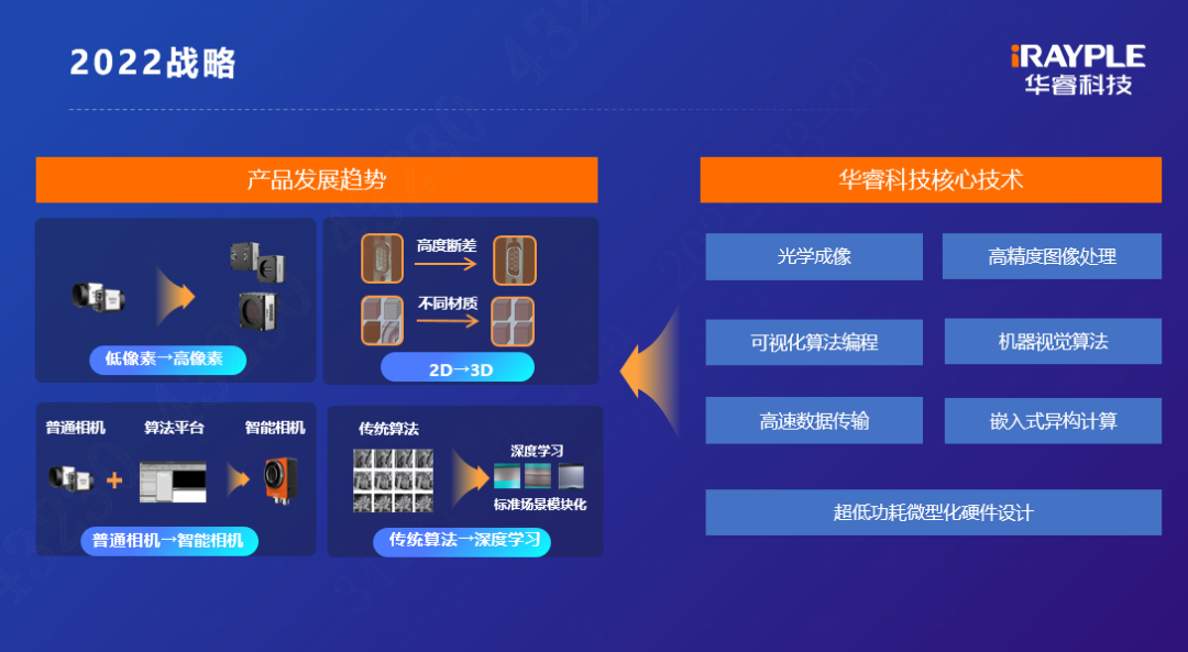 “机器视觉未来一个趋势是从2D视觉走向3D视觉,但目前基于3D的技术路线较多。”张博这样说。2022年,华睿科技将会基于线激光和双目结构光技术,推出新款的3D相机和完善3D产品系列。将日趋成熟的MVP算法平台算法因子移植到相机里面,发布3000、4000、5000系列读码器产品,满足不同场景读码要求。“未来算法将是从传统算法到深度学习的结合,在2022我们会发布全新的MVP深度学习平台。”