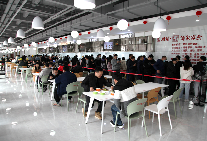 在食堂中,后勤人员只需要输入桌号,擎朗机器人就能精准找到下单职工位置,通过自动播报提醒顾客拿取餐品。目前,哈汽集团做到了从原材料采购到出菜时间、打餐、配送、消毒等每一个环节严格管理,最大程度地降低点餐送餐过程中的传播风险,让员工在用餐过程中更加卫生、安心。02白领食堂:智慧转型 提升食堂管理