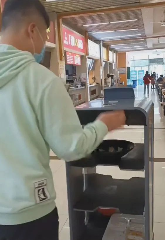 员工在食堂的小炒、面点等档口完成窗口点餐后,并不需要在窗口附近等候菜品,直接落座即可。擎朗机器人通过实时规划路径、识别障碍物智能避障,让员工在座位中即可安稳收到餐品,使食堂成为员工享受美食的好去处。04高校食堂:化身收盘侠,变为食堂新宠