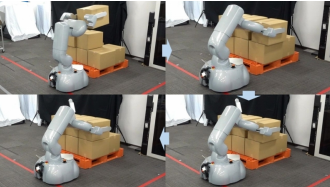 移动抓手是一种具有运行功能的码垛/卸垛机器人。您可以举起和搬运箱子等行李,并将它们堆放在托盘(装载平台)上。通过组合弯曲轴和升降轴,可以从接近地面的高度接近约 160 厘米的高度。箱体是通过左右夹入来提升的,但放置后推箱体的操作可以使货物没有任何间隙地装载。