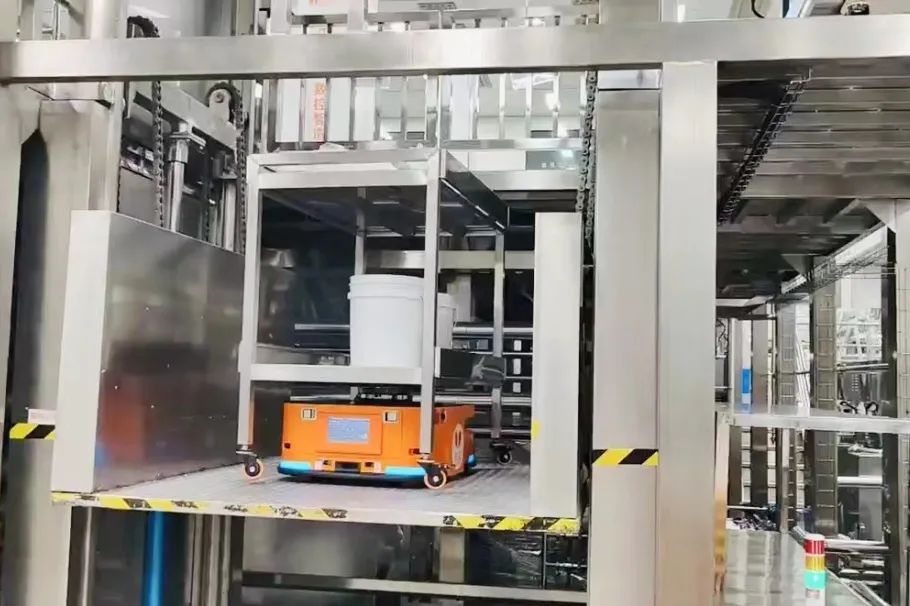 同时,由Gulf-1400-CDD无人叉车机器人负责原材料从原料仓到乳化车间的搬运、空桶的产线返回、半成品从产线到车间的中转、包材的产线搬运,搭配FMS调度管理系统,实现最优任务分配方案,让仓储物流整体效能最大化。