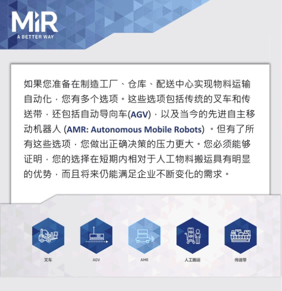 MiR致力于研发简单易用且灵活安全的机器人,帮助各类公司提高运营效率。MiR的自主机器人是新一代的先进移动机器人,具有投资回报快的特点,通常一年内就能收回成本。这些独特的协作机器人现已在工业及医疗保健行业大放异彩,帮助这些行业的制造商实现内部运输自动化。