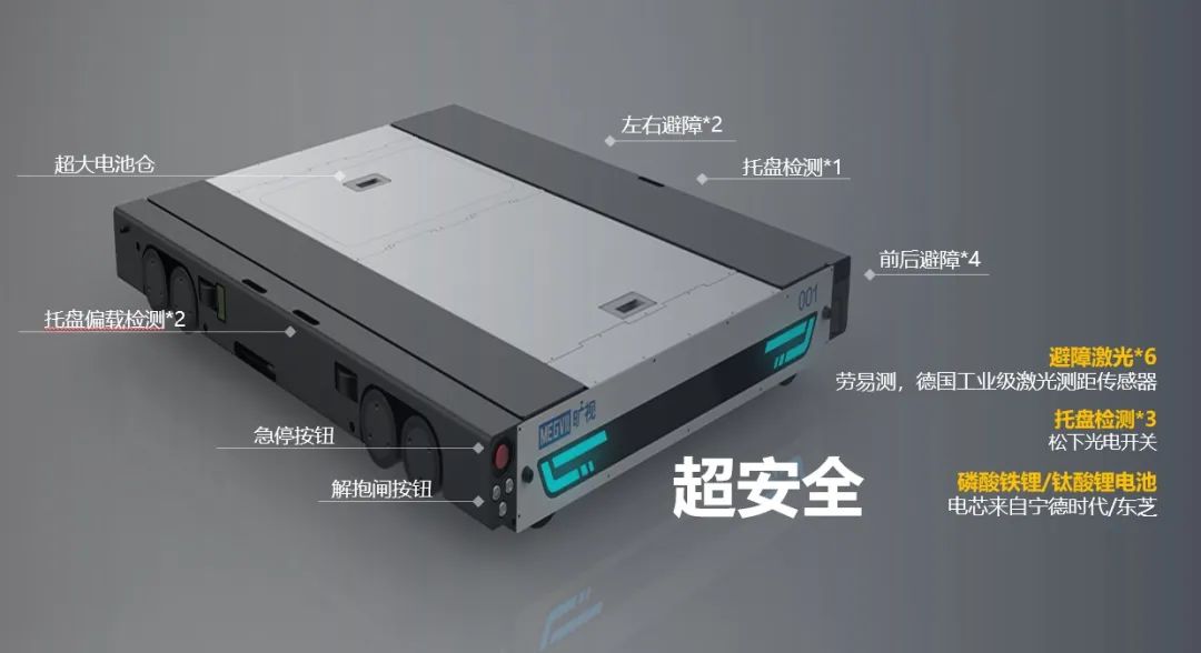 安全永远是生产的第一考虑因素。旷视核心零部件均选自头部供应商,品质严苛有保障。例如,旷视在车体里面、前后、左右共添加6个工业级激光测距传感器,让车体本身成为安全的最后一道防线。