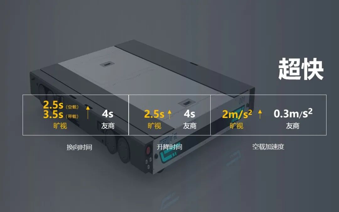 在换向优化上,旷视针对空载场景和带载场景进行分别优化,空载换向时间2.5s、带载换向时间3.5s。