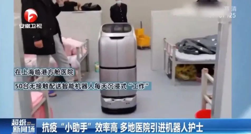 报道称:“在上海临港方舱医院,机器人不时发出语音提示,它与49个智能配送机器人一起负责3200张隔离床位的餐品、药品以及日用品的运输配送工作。这50台无接触智能配送机器人每天沉浸式工作,它们不需要穿防护服和戴口罩,只需要定期消毒即可。”