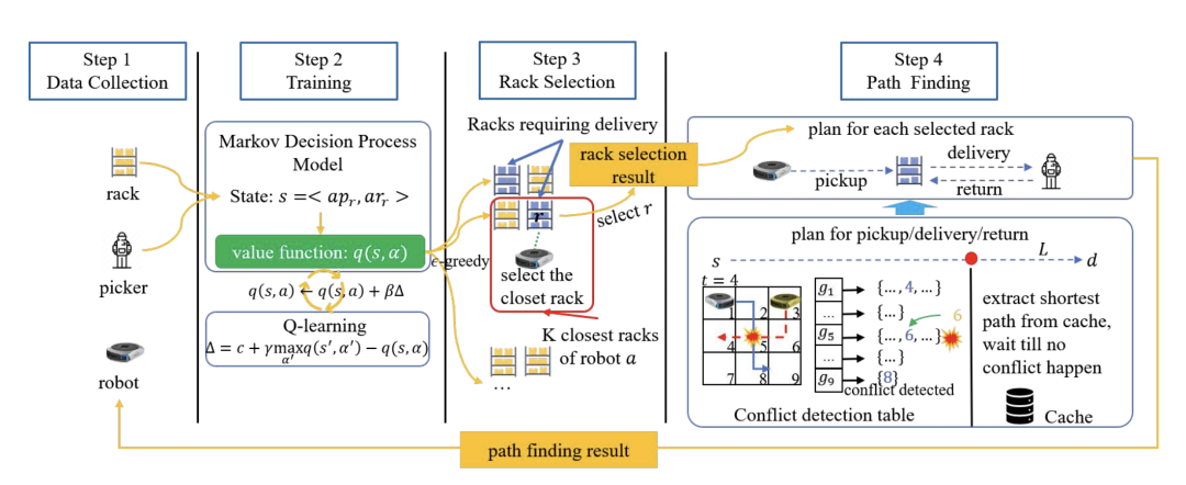 算法流程如图1所示。整个算法流程分为四个步骤:信息收集、模型训练、任务选择、路径规划。首先,算法收集拣货员、AMR和货架的时空信息(例如拣货员的拣货时间、货架的任务预计完成时间、AMR的位置信息等)。其次,收集完成后,自适应规划模块基于马尔可夫决策过程模型(Markov Decision Process, MDP)对时空信息建模,并使用强化学习中的Q-Learning方法训练价值函数。之后,算法基于价值函数选择合适的任务分配给AMR,最后基于选择方案为AMR规划路径。