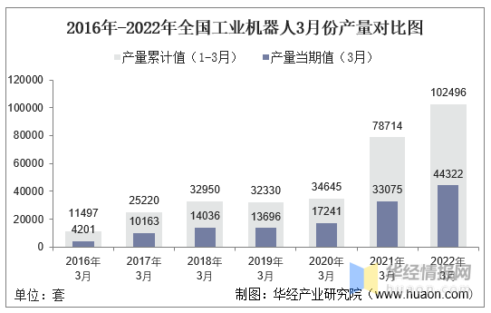 2016年-2022年全国工业机器人3月份产量对比图