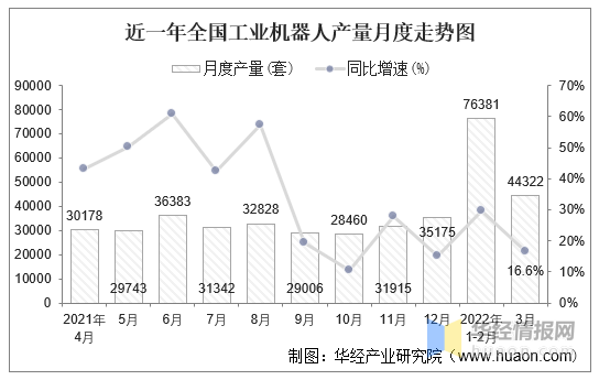 2022年3月全国工业机器人产量为44322套,比上年同月增加了11247套,同比增长16.6%,增速比1-2月回落13个百分点;日均产量为1429.74套。
