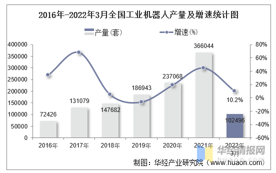 2016年-2022年3月全国工业机器人产量及增速统计图