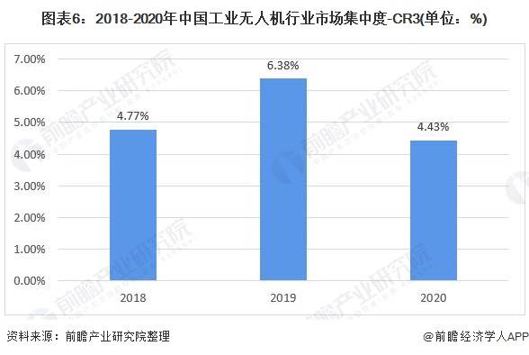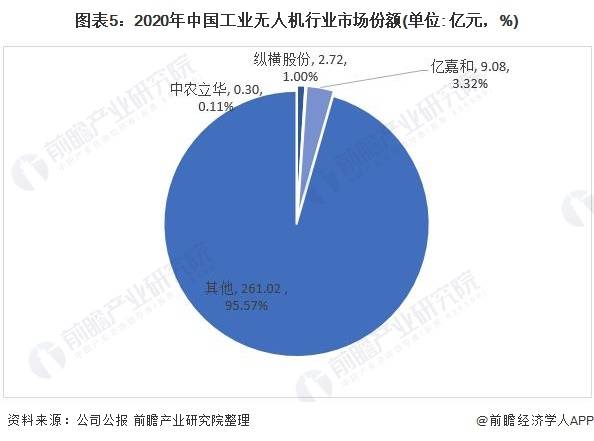根据弗若斯特沙利文数据,2020年,我国工业无人机市场规模约达273亿元。根据上市公司披露的无人机收入来看,亿嘉和营业收入为9.08亿元,占比最高,为3.32%。工业无人机行业CR3为4.43%,行业集中度较低。