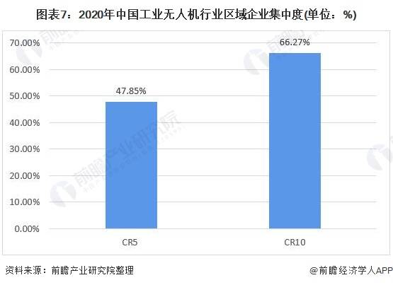 2018-2020年,工业无人机行业市场集中度波动变化。2020年CR3为4.43%,较2019年下降1.95%。由于工业无人机行业竞争者众多,行业竞争日益激烈,行业内企业将横向拓宽产业链,通过“整机销售+作业服务+数据方案”的商业模式创造竞争优势,提高市场份额。从企业区域分布来看,工业无人机企业分布较为集中,CR5为47.85%,CR10为66.27%。其中,行业内企业数量最多的前五个省份分别是江苏、广东、山东、浙江、上海。