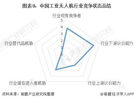 根据以上分析,对各方面的竞争情况进行量化,5代表最大,0代表最小,目前我国工业无人机行业五力竞争总结如下: