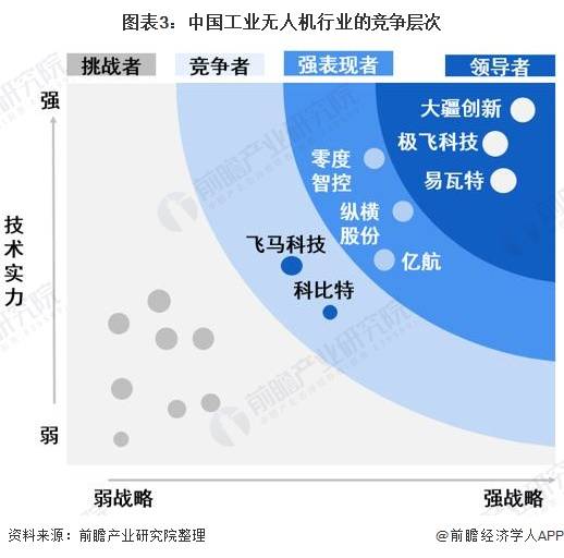 我国工业无人机市场起步晚,发展速度虽快但整体规模较小。目前,根据技术实力和战略布局,我国工业无人机企业分为三个梯度,其中,大疆创新、易瓦特、极飞科技凭借其出色的技术实力和不断优化的战略布局成为行业内的领导者。零度智控、纵横股份等龙头企业表现较为突出,其技术水平也在不断提高。而飞马科技、科比特则在无人机测绘领域和无人机巡检领域成为行业内有力竞争者。