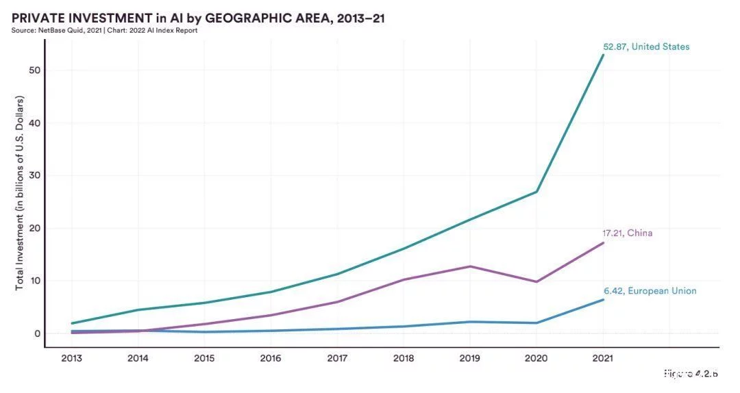 请输入图说2013-2021年中美在AI领域私有部门(如风险投资、个人投资等)投资金额上差距逐渐拉大