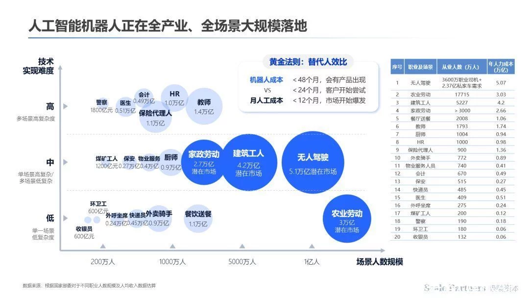4.机构在智能机器人领域投的不只是智能硬件或国产替代,而是在押注未来数个万亿级、数十个千亿级、上百个百亿级职业场景的无人化。在未来,机器人还将推动专业、细分领域的服务普及化,例如让更多人低成本、便捷地享受到高质量的情感陪伴、心理干预治疗等服务。