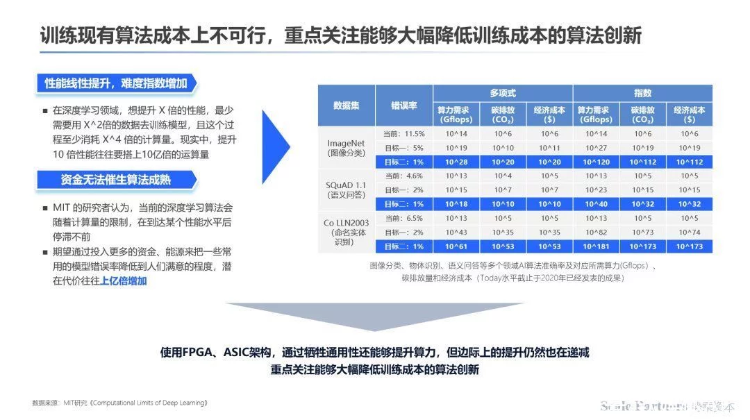 MIT Digital Lab的研究者联合韩国的相关机构在2020年发表了一项基于1058篇深度学习的论文和数据的研究。在分析了现有的深度学习论文成果后,研究人员提出了一个悲观的预言:深度学习会随着计算量的限制,在到达某个性能水平后停滞不前,因为在深度学习领域有这样一条规律:想提升 X 倍的性能,最少需要用 X^2倍的数据去训练模型,且这个过程要消耗X^4倍的计算量。即便是10倍性能提升和1万倍计算量的提升,这样失衡的比例关系也仅仅是理论上最优的。在现实中,提升10倍性能往往要搭上10亿倍的运算量。以今天地球资源的状况看,想把一些常用的模型错误率降低到人们满意的程度,代价高到人类不能承受。因此,在深度学习领域非常值得关注的是可大幅降低训练成本的新算法创新。