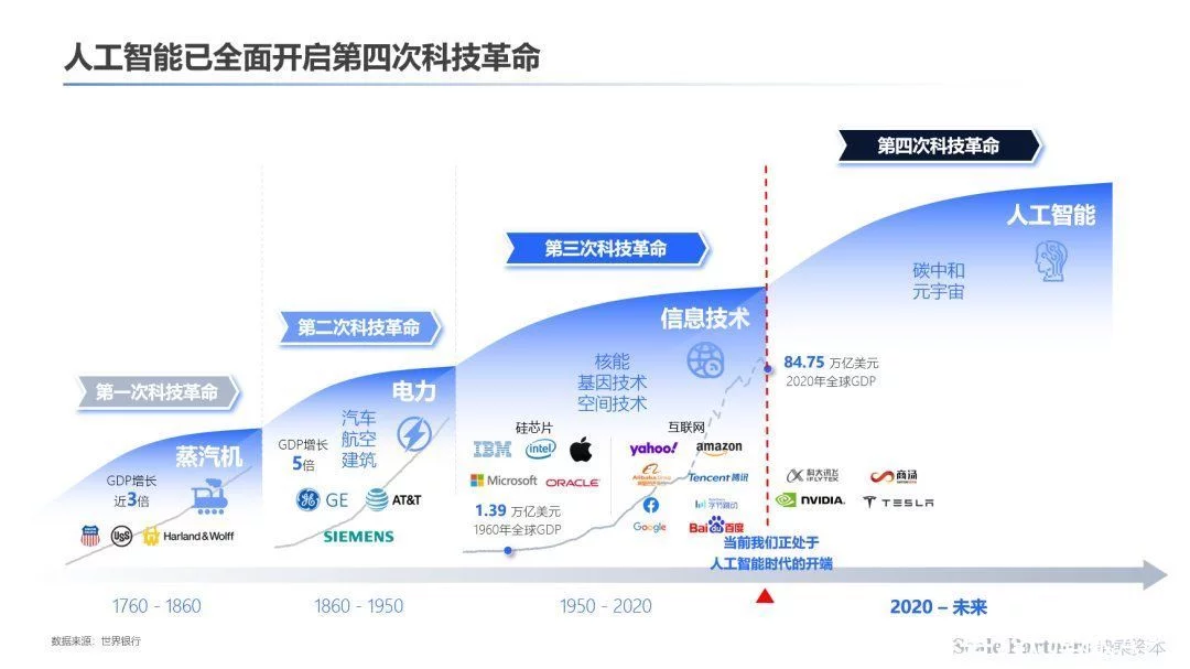 在过去的260年间,人类社会经历了三次巨大的科技创新浪潮,蒸汽机、电力和信息技术,将全球GDP提升了近千倍。每一次科技浪潮都通过某一项先进生产力要素的突破,进而引起大多数行业的变革:比如蒸汽机的出现推动了汽车、火车、轮船、钢铁等行业的巨大发展,140年前美国铁路行业的恶性竞争史,就如同现今互联网行业BAT之间的竞争。而铁路行业发展、兼并所需的巨额金融资本,又驱动了华尔街的发展,逐渐成为全球的金融中心。