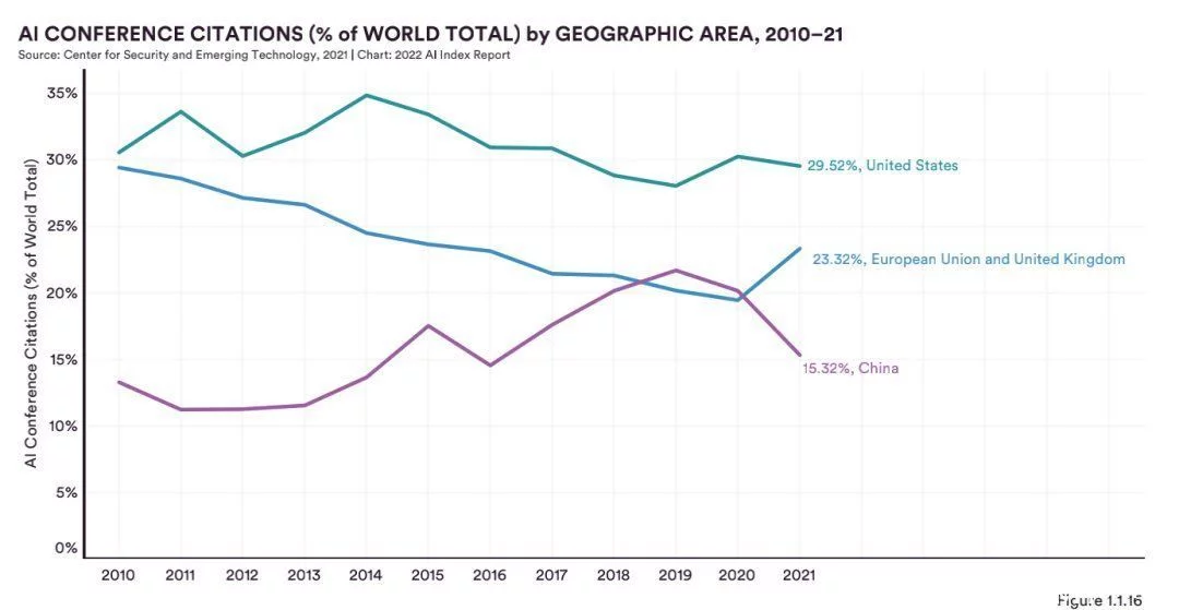 尽管中国已经跻身人工智能领域的大国,但是我们必须认识到中美之间在AI领域仍然有着明显的差距。从投资金额和布局上看,从2013年到2021年,美国对人工智能公司的私人投资是中国的2倍多。当前美国AI企业数量领先中国,布局在整个产业链上,尤其在算法、芯片等产业核心领域积累了强大的技术创新优势。更关键的是,尽管近年来中国在人工智能领域的论文和专利数量保持高速增长,但中国AI研究的质量与美国仍然有较大差距(集中体现在AI顶会论文的引用量的差距上)。