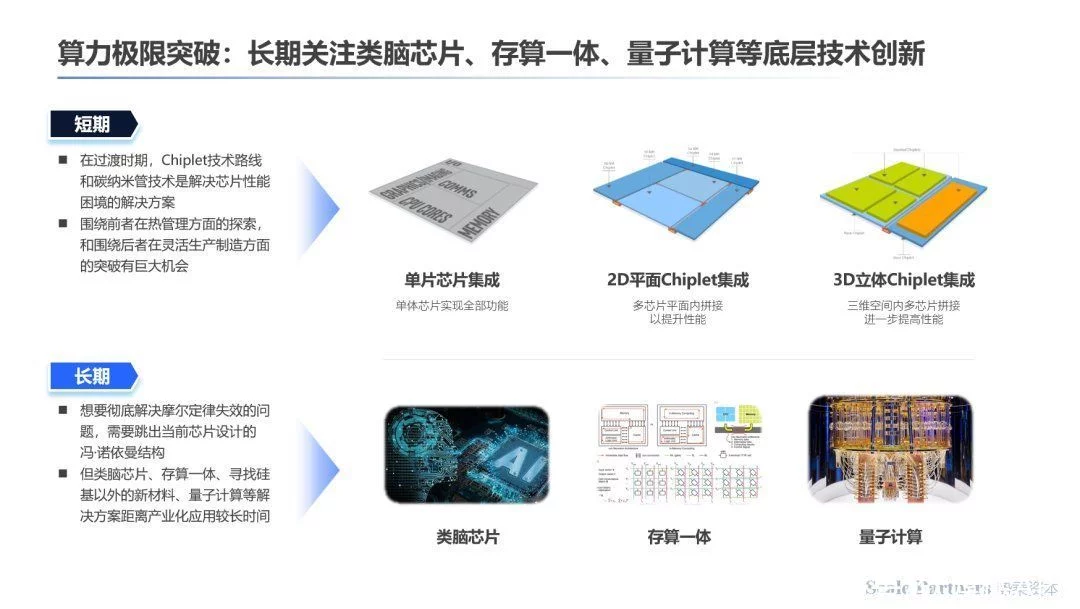 短期内,围绕Chiplet技术在热管理方面的探索,和碳纳米管技术的灵活生产制造突破是算力层面上我们重点关注的机会。当然,我们也要了解目前类脑芯片、存算一体和量子计算等终局解决方案的相关情况。这里为大家简单介绍如下: