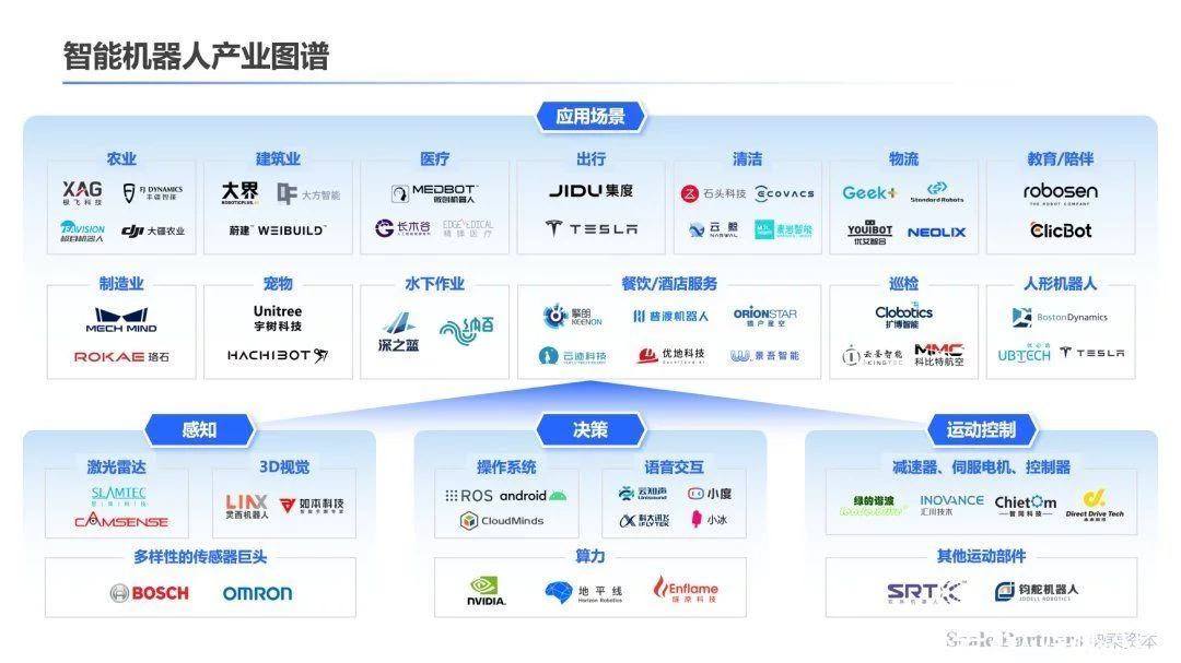三大要素中既有专精于某一环节的零部件或软件供应商机会(如核心零部件、操作系统、关键控制算法等),也有整合了其中2-3个环节的关键技术要素,为细分场景提供全套服务的应用机会(例如在清洁、配送、交通等场景的机器人服务商)。