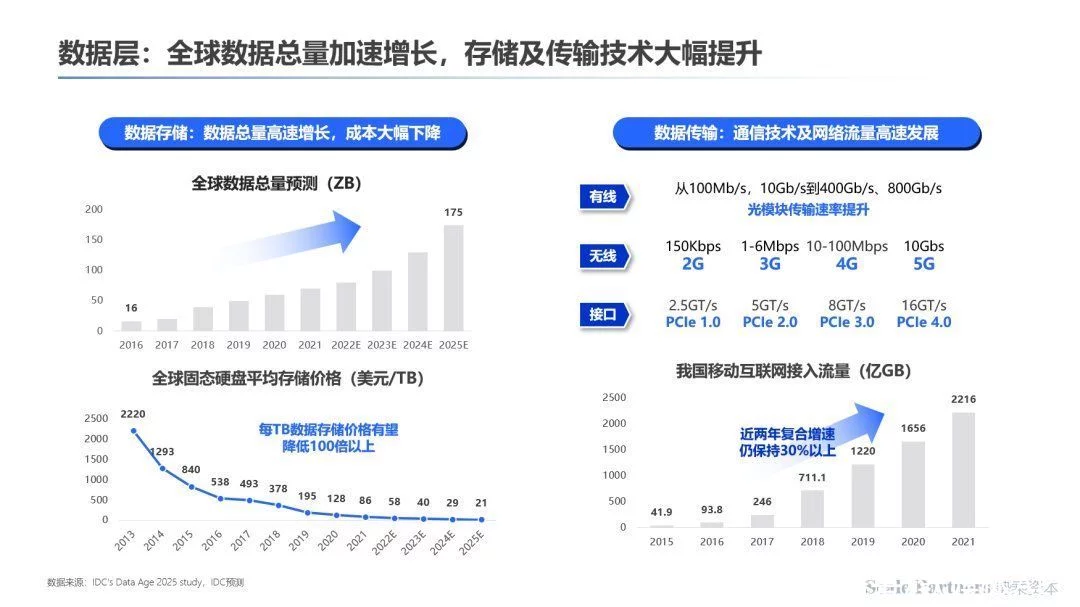 算力层包括具备计算能力硬件和大数据基础设施。回顾历史我们就会发现,历次算力层的发展都会显著推动算法层的进步,并促使技术的普及应用。21世纪互联网大规模服务集群的出现、搜索和电商业务带来的大数据积累、GPU和异构/低功耗芯片兴起带来的运算力提升,促成了深度学习的诞生,促成了人工智能的这一波爆发。而AI芯片的出现进一步显著提高了数据处理速度:在CPU的基础上,出现了擅长并行计算的GPU,以及拥有良好运行能效比、更适合深度学习模型的现场可编程门阵列(FPGA)和应用专用集成电路(ASIC)。