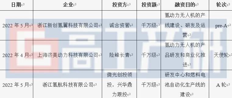 在市场需求和政策支持的共同推进下,氢能无人机市场获得资本青睐,其中代表性企业如浙江氢航、济美动力、新创氢翼等均已获得千万级投资。而入局氢燃料电池无人机的企业还包括斗山创新、国电投氢能等行业巨头。