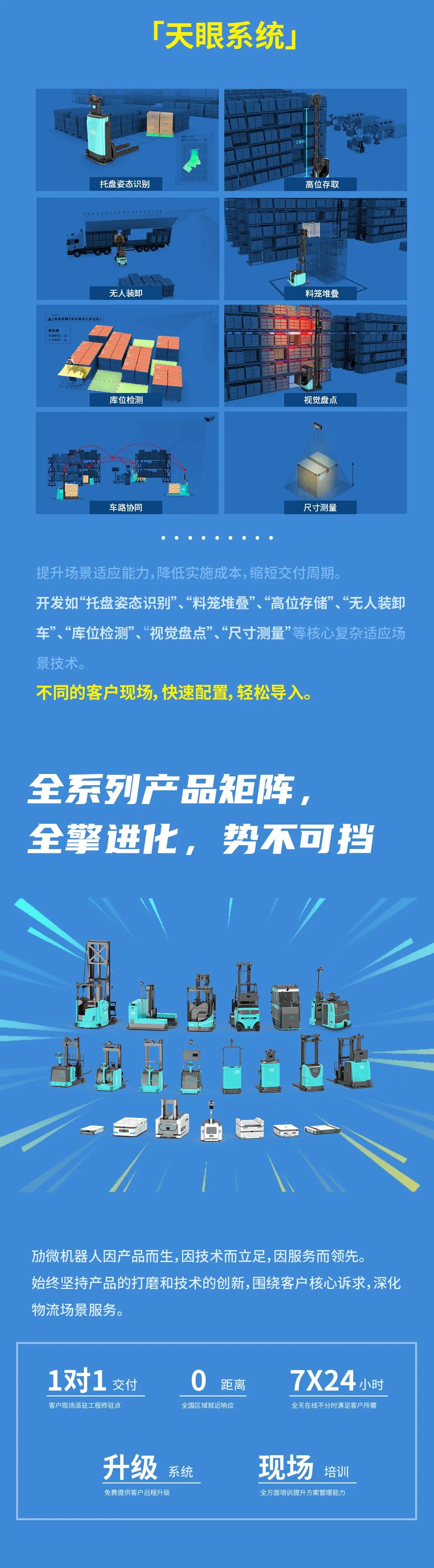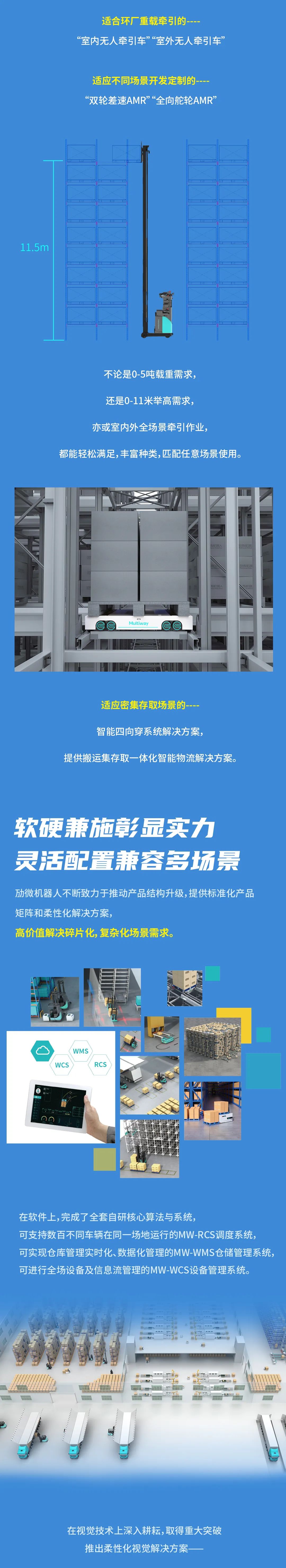 劢微机器人专注于先进的机器人与人工智能技术,为客户提供完整的智能制造及智慧物流解决方案。硬件产品包括:各类型无人叉车、AMR、无人牵引车及仓储机器人;软件系统包括:劢微云、WMS、WCS、现场管理系统及多种视觉解决方案,已在工厂、仓储、物流等领域交付了大量标杆项目,成为行业领先客户信赖的合作伙伴。