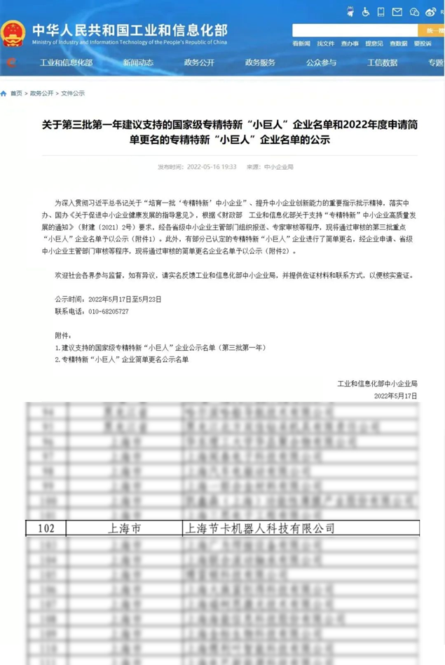 5月17日,工业和信息化部中小企业局公示了关于建议支持的国家级专精特新“小巨人”企业名单(第三批第一年),节卡机器人成为上榜的20家上海企业之一。这也是节卡继入选上海市科技“小巨人”、国家级专精特新“小巨人”企业之后,发展与成长的第三次进阶。