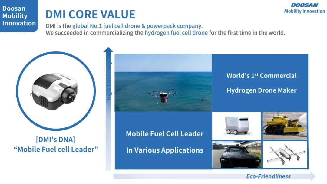 斗山创新是斗山集团在2016年成立的全资子公司,依靠自有核心技术,致力于开发高性能移动式轻量化燃料电池系统。产品线主要包含1-5kW空冷系统以及5-30KW轻量化水冷系统,目前产品主要应用在工业级无人机,无人船以及机器人领域,后续将量产用于叉车、工程机械、备用电源以及载人飞行器等领域。产品立足国际市场,先后通过了多项国际认证标准,目前多款燃料电池系统已经完成FCC、CE认证,储氢系统完成美国DOT认证、加拿大TC、欧洲TPED、韩国KGS等国际认证,产品和技术均为全球领先水平。