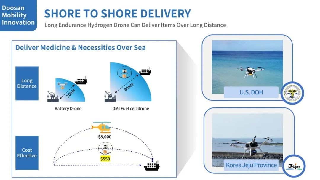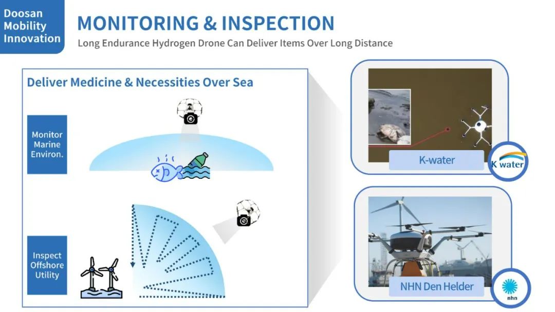斗山创新开发的氢动力无人机广泛应用于海洋,陆地等各个场景,尤其是海洋领域的救援作业,岛屿配送作业,远海监控作业等。