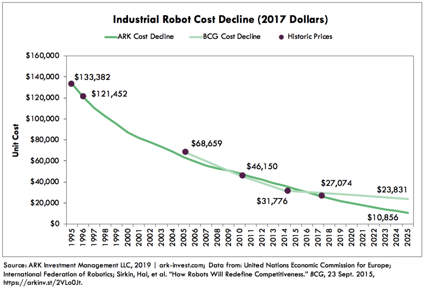 在2019年,美国纽约资产管理公司方舟投资(ARK)的一份研究报告指出,到2025年,工业机器人的成本将下降50-60%,每台成本将低于11000美元,此价格远低于波士顿咨询集团(BCG)的24000美元左右的预期。