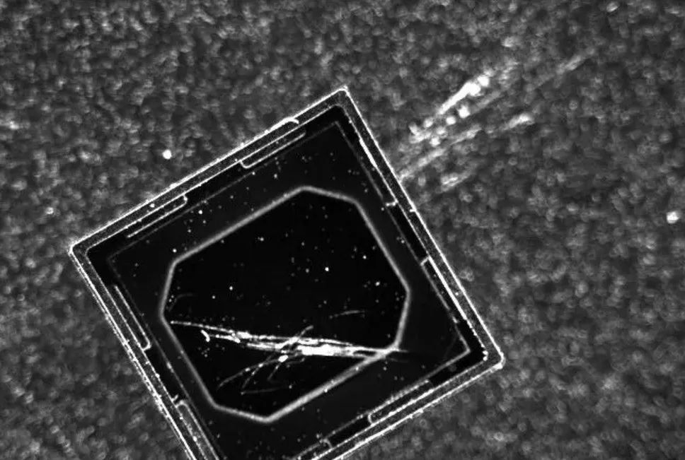 这是一个手机镜头模组,高约6mm,中间有一块透明的有划伤的玻璃镜片。
