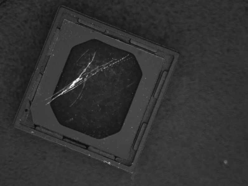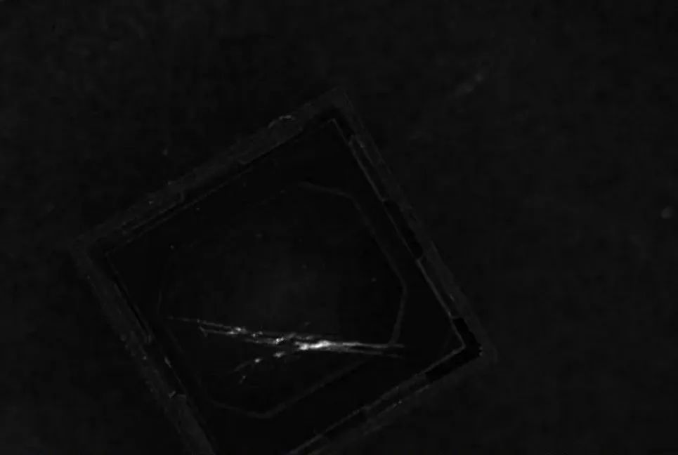 从上面的两组图片可以看出,如果想检测模组的镜片划伤,在合适的高度用90°环形光打光,能得到一张高质量的易于处理的图片。