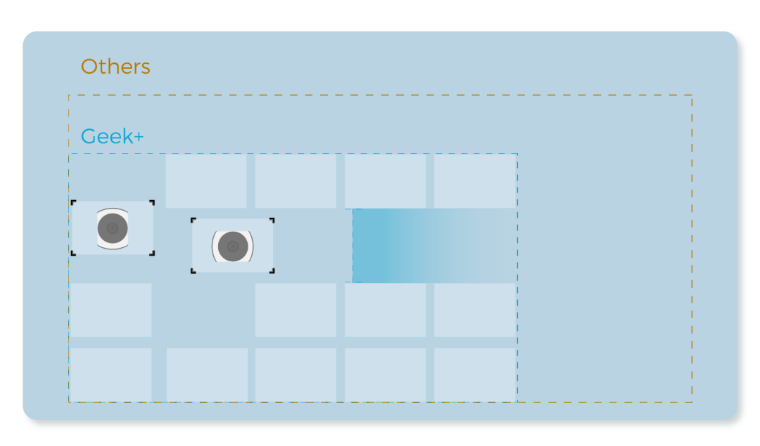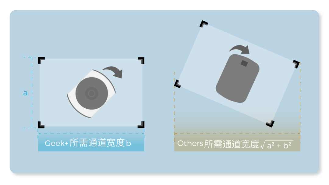 机器人自转弯不带动货架,通道宽度要求更小,货架存储更密集,提高空间利用率。