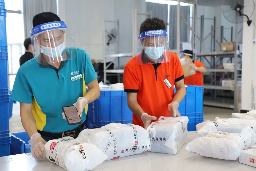 海南邮政免税中心工作人员扫描包裹 . 图片源于:中国邮政