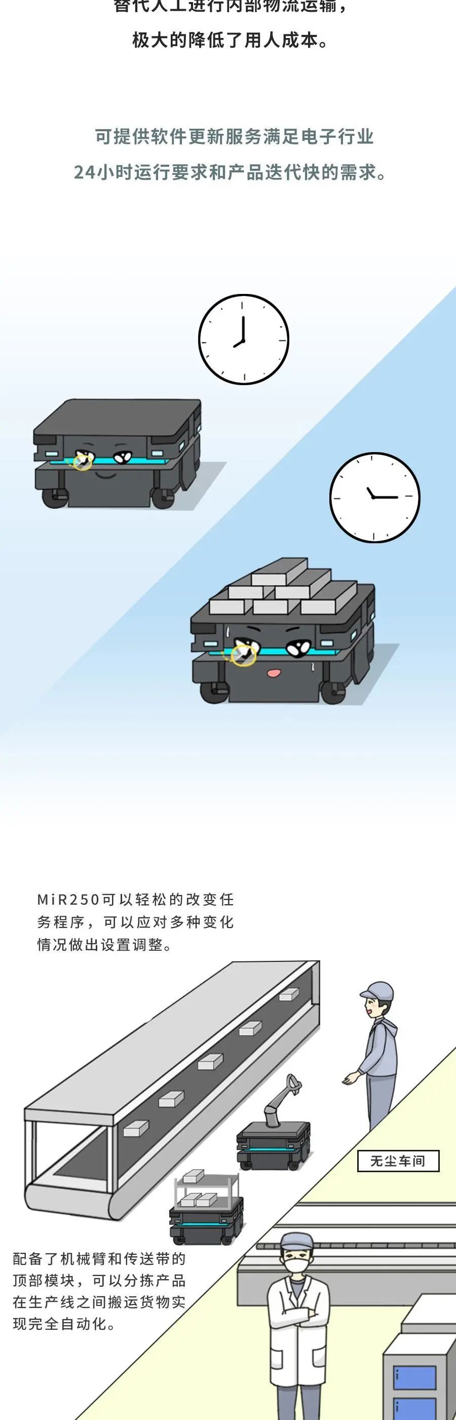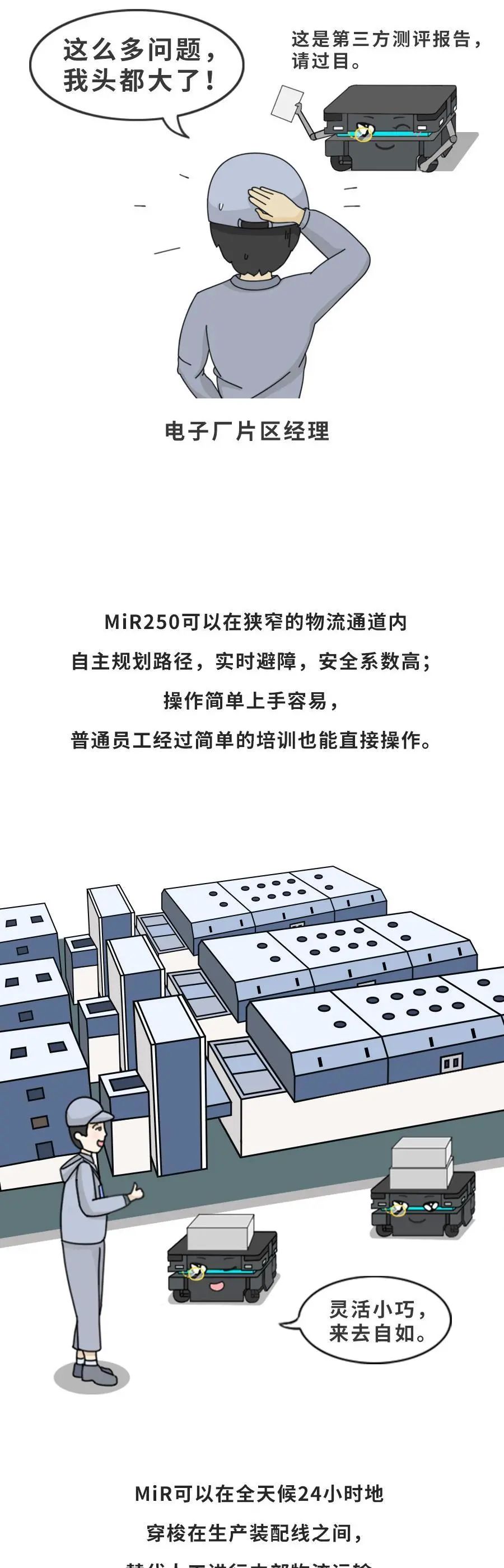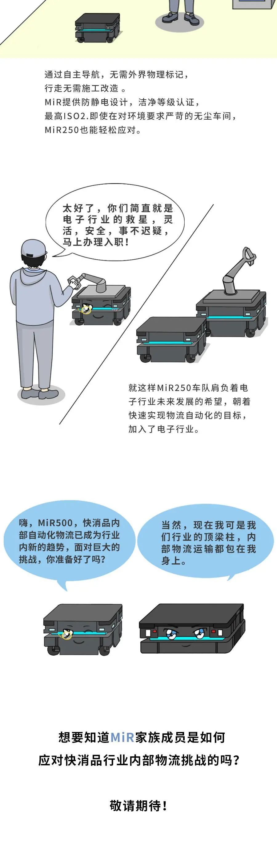 MiR致力于研发简单易用且灵活安全的机器人,帮助各类公司提高运营效率。MiR的自主机器人是新一代的先进移动机器人,具有投资回报快的特点,通常一年内就能收回成本。这些独特的协作机器人现已在工业及医疗保健行业大放异彩,帮助这些行业的制造商实现内部运输自动化。