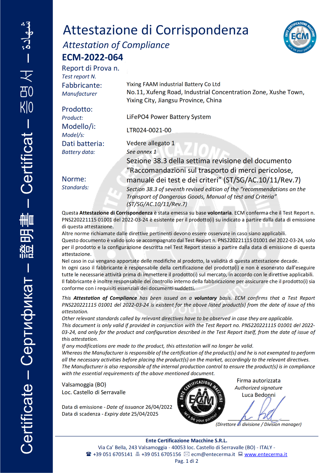 For obtaining certificates, FAAM China collaborated with ECM Shanghai (Ente Certificazione Macchine - Shanghai), which can boast a consolidated experience in testing activities and compliance with lithium batteries and their application, ranging from different sectors. Thanks to a team of highly specialized technicians and a dense network of partner laboratories, ECM represents the ideal partner to put in the market certified security batteries.