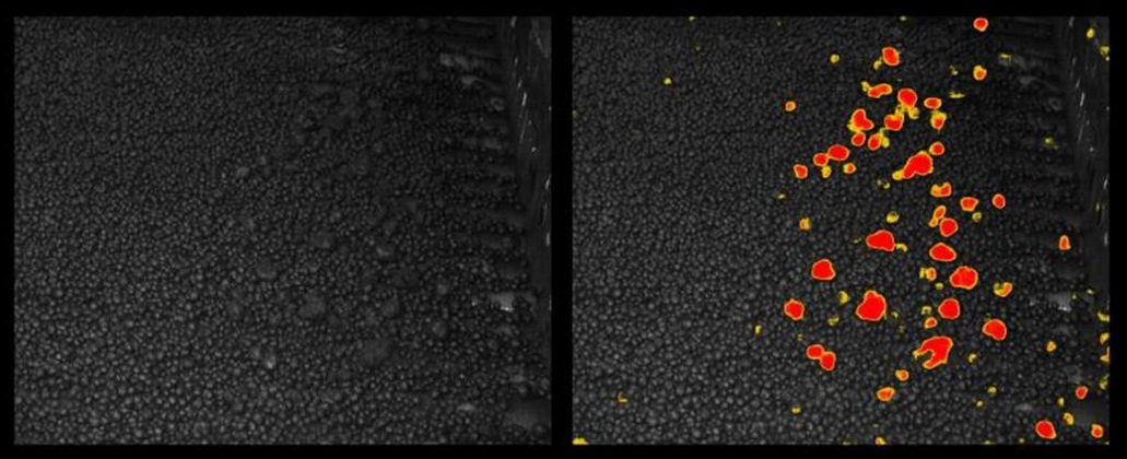 利用深度学习识别超过标准尺寸的矿料球,实时控制工艺原材料配比。铁粉原料多为深黑色,且为不规则球形,具有反光度低,外形轮廓不明显的特点,普通算法很难提取到有效特征,无法对表面相似的矿料球进行尺寸区分。矩视智能低代码平台采用AI深度学算法,只需少量图片样本,即可对超限矿料球准确捕捉、计数。从而通过设备通讯实时反馈,改善工艺过程原料配比。与依据经验判断的人工监测方式相比:机器视觉监测具有更强稳定性与确定性,且易进行数据总结与统计;对于恶劣工况环境与全时段连续监测来说,机器视觉具有更强的适应性;进而有效预防及减少异常情况给产线带来的损害与停机检查导致的时间损失。